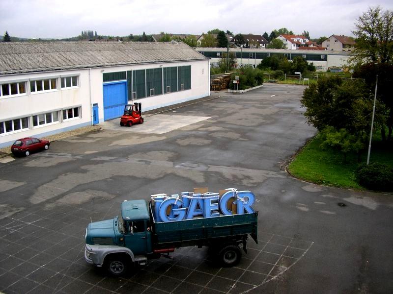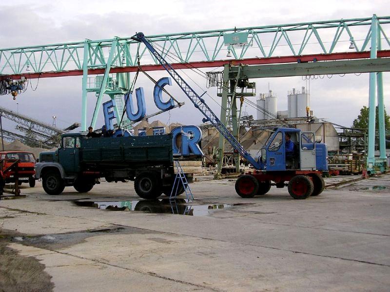 25.09.2004 - Ein weithin sichtbares Wahrzeichen in Bad Schönborn muss weichen. Der Fuchs-Schriftzug auf dem Werksdach kündigte vielen Berufspendlern mit der Bahn den heimatlichen Bahnhof an. Das liebgewonnene Wahrzeichen wurde von unseren Mitgliedern demontiert und zunächst in der Halle eingelagert. Mittlerweile leuchtet dieser in unserer großen Halle über den alten Fuchs-Maschinen