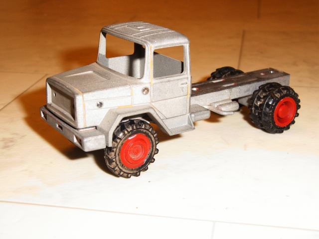 Der Grundrahmen ist gekürzt, der Achsstand auf 84mm (4200mm) geändert. Das gesamte Modell ist gestrahlt worden. Während sich die Farbe am Grundrahmen sehr gut abstrahlen lies, mußte das Fahrerhaus vorher 2 Wochen in Verdünnung liegen.