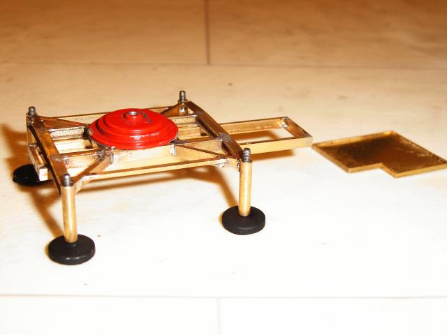 Der Aufbaurahmen wurde aus Messingprofilen zusammengelötet. Der Hilfsrahmen ist bereits darunter befestigt, die Hilfspritsche liegt davor. Das Verbindungsteil zum Oberwagen wurde aus dem Unterwagen des Fuchs-Baggers gefertigt.