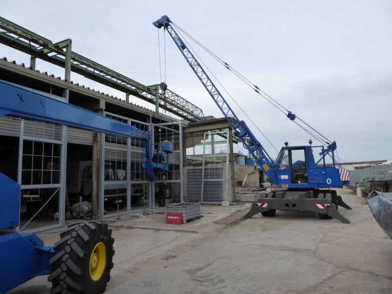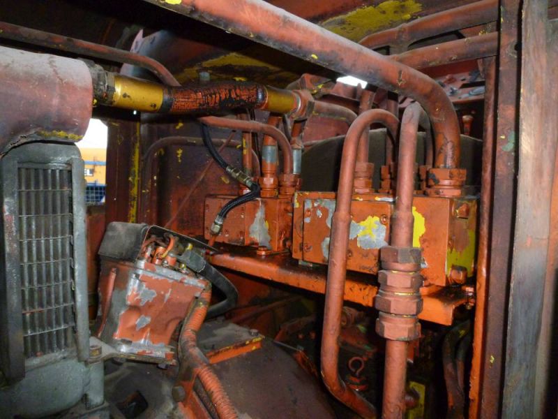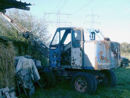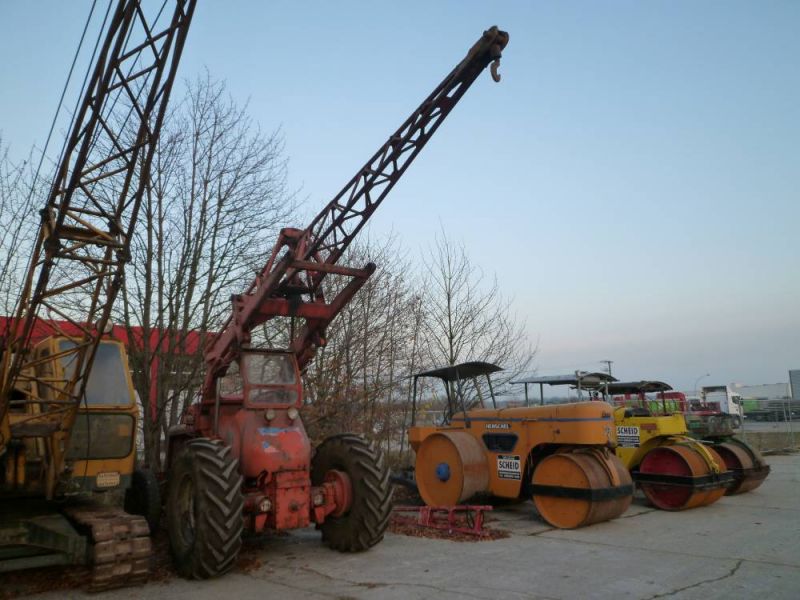 Von den vielen Fuchs 301 in unserer Halle ist diese Maschine die jüngste und bildet den Ab-schluss der Entwicklung des Fuchs 301. Die Maßgebliche Entwicklung war bereits Anfang der 1970er Jahre abgeschlossen. Im Jahr 1978 kam bereits der vollhydraulische Fuchs 110 auf den Markt, 1979 die leichtere Variante, der Fuchs 107. Aus Restbeständen wurden die letzten Ma-schinen bis 1982 ausgeliefert. Die wichtigsten Änderungen im Laufe der Bauzeit ab 1957 waren: - Steigerung der Motorleistung von 22 bis auf 30 PS - Verbreiterung der Ober- und Unterwagen - mechanische Lenkung zu hydraulischer Lenkung - mechanische Abstützung zu hydraulischer Pendelachsabstützung - Verstärkung der Winden, einhergehend mit der Erhöhung der Motorleistung - Differentialgebremste Winden aus Sicherheitsgründen. Bei den Freifallwinden muss das Pedal getreten werden um die Last zu bremsen, bei den differentialgebremsten muss das Pedal ge-treten werden um die Bremse zu lösten - Einbau der Auslegersonderwinde. Damit konnte der Ausleger unabhängig vom restlichen An-triebsstrang bewegt werden. - Einbau von Überlast- Hub- und Auslegerwarneinrichtungen Noch heute findet man einzelne 301er im Einsatz, über 35 Jahre nach Ende der Bauzeit. Und in der Oldtimerszene ist das mittlerweile eine beliebte Maschine geworden. Diese Maschine wurde 1979 an die Firma Di ringer und Scheidel nach Mannheim geliefert und kam von dort in unsere Hallen.