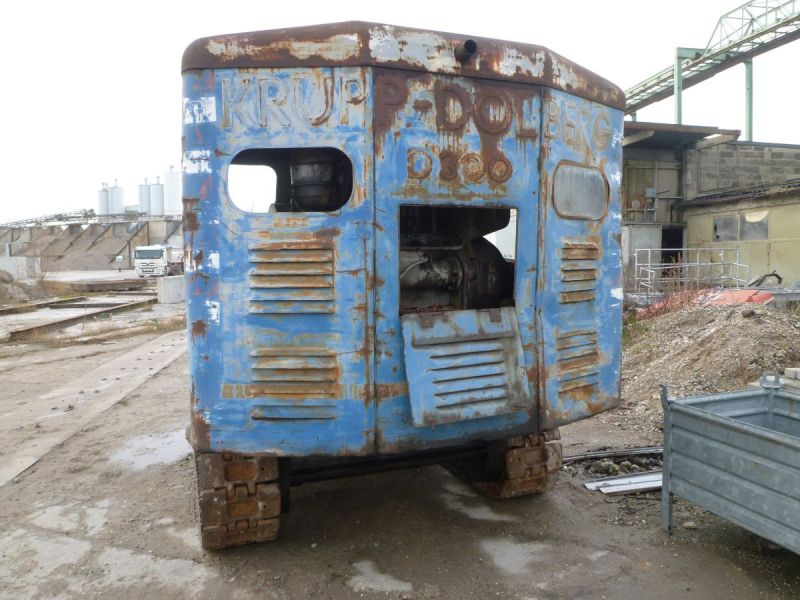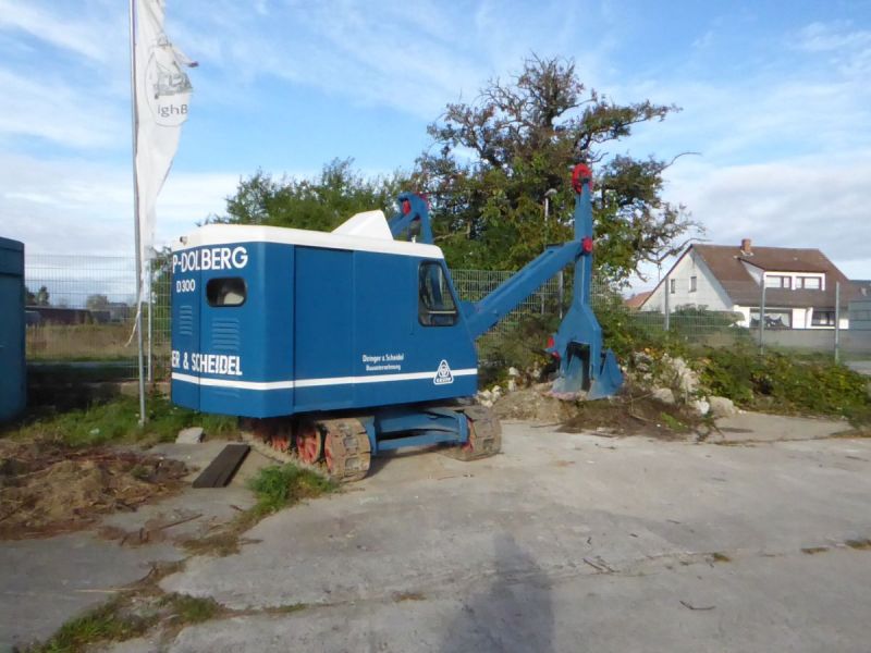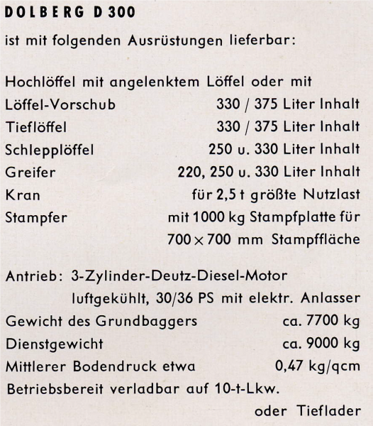 Bereits 1951 stellte Dolberg den D200 auf dem Markt vor. Dieser verlangte kleine, wendige Ge-räte um die lohnintensiven Erdarbeiten zu rationalisieren. Die ersten Geräte wurden noch mit kittverglasten Sprossenfenster ausgeliefert, während sehr bald die bekannte Form der Maschi-ne entwickelt wurde. Der 6,0 to leichte Bagger konnte auf die Pritsche eines Lkw verladen wer-den und so schnell die Baustellen wechseln. Während die Normalausführung mit 4-Rollen Ket-tenlaufwerk einen Bodendruck von 0,42 kg/cm² besaß, war ein 5-Rollen-Laufwerk mit einem ge-ringeren Bodendruck von 0,25 kg/cm² im Angebot. Für die Maschine wurden 0,22cbm Hoch- und Tieflöffeleinrichtungen angeboten, ebenso ein Gittermast mit 6,0 bzw. 8,0m Länge und 0,2 cbm Greifer. Als Kran konnte die Maschine Lasten bis 1,5to heben. Ebenfalls im Angebot war ein Spezialtieflader, welcher auf die Größe des D200 abgestimmt war. Unsere Maschine war zunächst bei der Firma Schön in Speyer im Einsatz, bevor sie als Leihgabe an das Straßenmuseum Germersheim übergeben wurde. Dort fristete sie ihr Dasein im Aussen-lager, da in der Ausstellung kein ausreichender Platz vorhanden war. Im Jahr 2004 konnten wir die Maschine als eine der ersten vereinseigenen übernehmen. Nach kurzer Instandsetzung des Motors steht das Gerät jetzt voll betriebsfähig zur Verfügung.