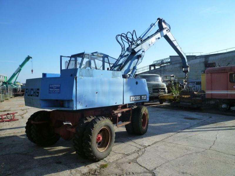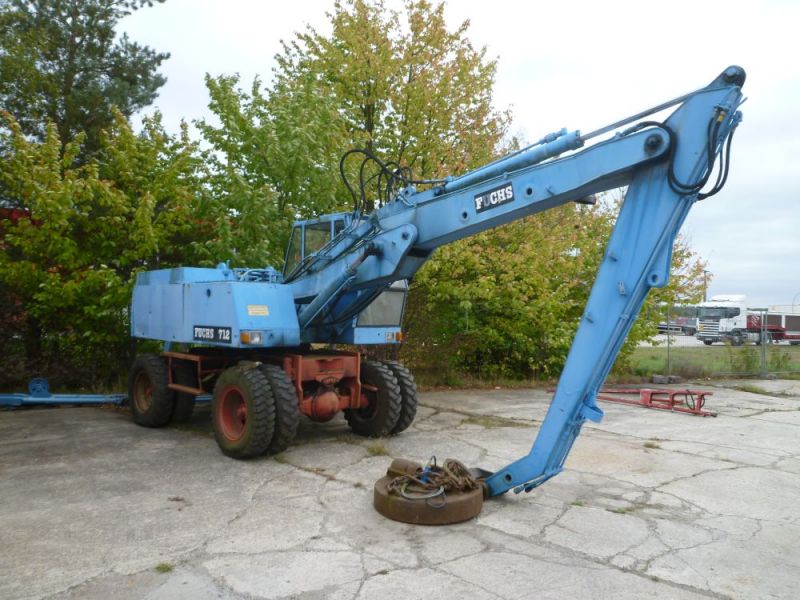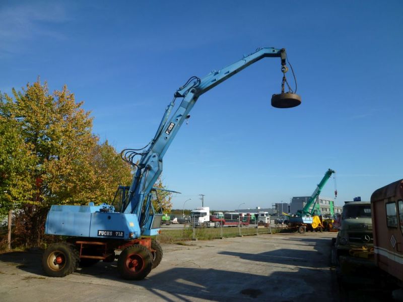 Der Fuchs 712 ist die Weiterentwicklung des Fuchs 702 und wurde 1973 vorgestellt. Die moder-ne Form der Maschine wurde vom Industriedesigner Louis Lucien Lepoix entworfen und erhielt den Industriepreis „moderne Form“. Mit dem F712 hat Fuchs ein beliebtes Baustellengerät auf den Markt gebracht, welcher mit vielen Tiefbauausrüstungen bis hin zu leichten Drehbohrgerä-ten ausgestattet war. Einige Maschinen sind bis heute im Einsatz. Gleichzeitig wurden aus dem 712er die ersten reinen Umschlagmaschinen entwickelt. Während unsere Maschine noch einen zweiteiligen Ausleger mit gekröpftem Stiel für den Materialumschlag besitzt wurden die Ausle-ger bald einteilig konstruiert und so von Materialwirtschaft gerne angenommen. Unsere Maschine war zuletzt im Schrott-Umschlag bei einem Schrotthändler in Bellheim im Ein-satz. Nach der Einstellung des Betriebs kam die Maschine zunächst zu einem Schrotthändler nach Mannheim, von wo wir sie dann im Jahr 2011 erwerben konnten. Mit Lasthaken ist die Maschine noch immer auf unserem Hof für viele Hebearbeiten aktiv.