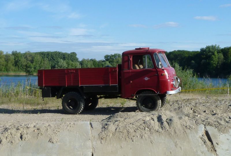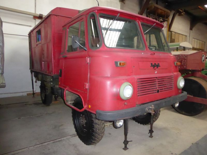 Ex-Feuerwehrfahrzeug, Ausstellscheibe fürs Geländefahren. Hersteller: VEB-Robur-Werke GmbH, Zittau Dieser LO Lastwagen wurde 1964 für die Feuerwehr gebaut. Die Feuerwehrausrüstung kam aus dem Feuerlöschgerätewerk Görlitz. Üblicherweise wurden die Feuerwehr-Fahrzeuge mit dem Militärfahrgestell ausgeliefert (lediglich der Motor blieb „nicht vorverlegt“), dann mit der Feu-erwehrsonderpritsche und mit einer festen Plane, versehen. Es wurde unter anderem eine Tragkraftspritze aufgeladen und ein Schlauchanhänger angehängt. Dieser Feuerlöschwagen war so bei einer nicht bekannten Feuerwehr bis ca. 1990 im Einsatz. Nach der Wende wurde er ausgemustert und privat für Holz-Transporte im Wald genutzt. Dabei wurde die Feuerwehraus-rüstung entfernt, die Spriegel abgesägt und ihm durch rohen Einsatz zahlreiche Verbeulungen zugefügt. Der letzte Vorbesitzer in Landshut hatte den Wagen im Internet gekauft und war mit der Größe des Fahrzeugs und seinen Eigenheiten überfordert. Er hatte auf einen Dieselmotor umrüsten wollen und gab das Vorhaben bei Historisch zugelassenem und zerlegtem Fahrzeug auf. Der LO Lastwagen ist das Ponton zum Unimog S, wobei hier einfache robuste Lastwagentechnik der dortigen Technischen Raffinesse, bei vergleichbarer Geländegängigkeit, entgegensteht.