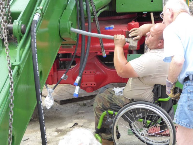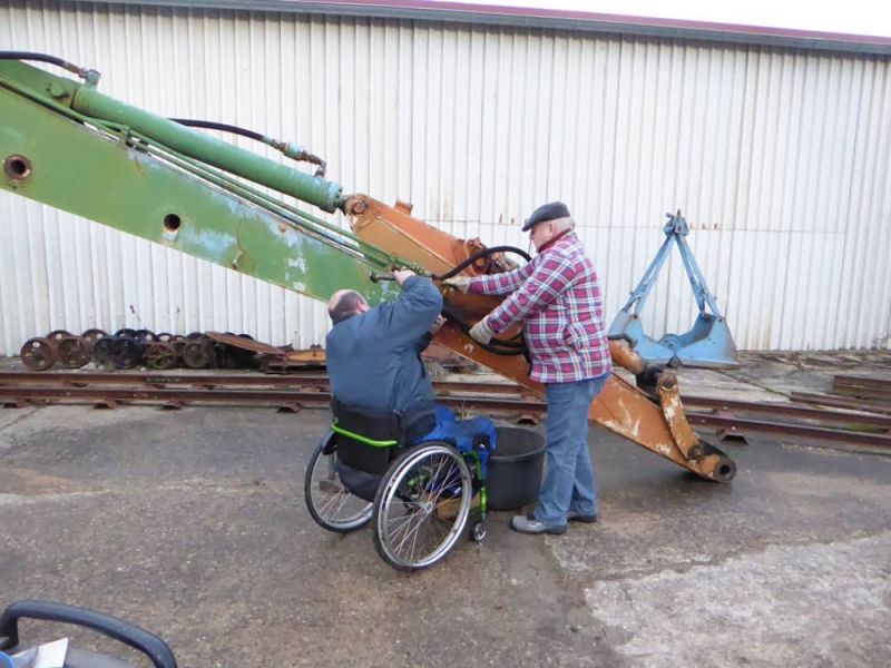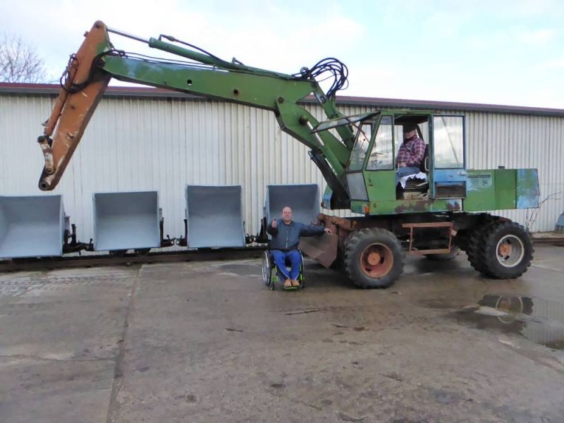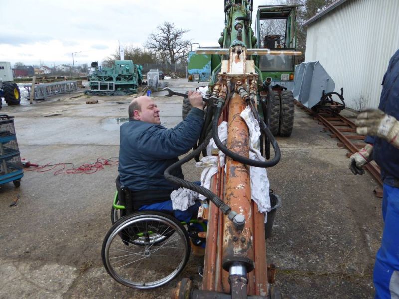 Rechtzeitig zum Tag der offenen Tür wurde der Stiel und der Löffel fertig. Der musste natürlich noch montiert werden. Anschließende hat der Besitzer seinen Rollstuhl gegen den Baggersitz getauscht. Die Mühe hat sich gelohnt. Die Probefahrt wurde erfolgreich abgeschlossen.