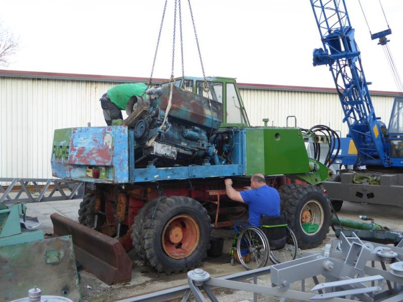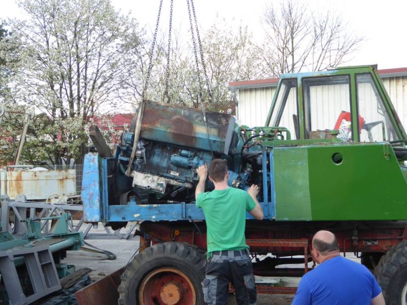 Mittlerweile wurde der Träger abgebaut. Heute ist die Demontage des Motors geplant. Eine sehr knifflige Angelegenheit. Auch dazu ist wieder der Fuchs 110 ausgerückt. Kollegen helfen sich eben.