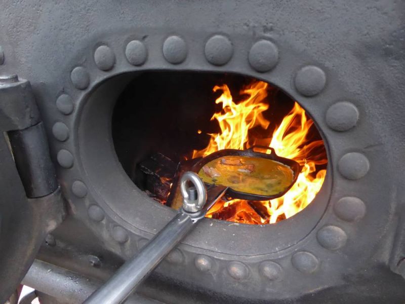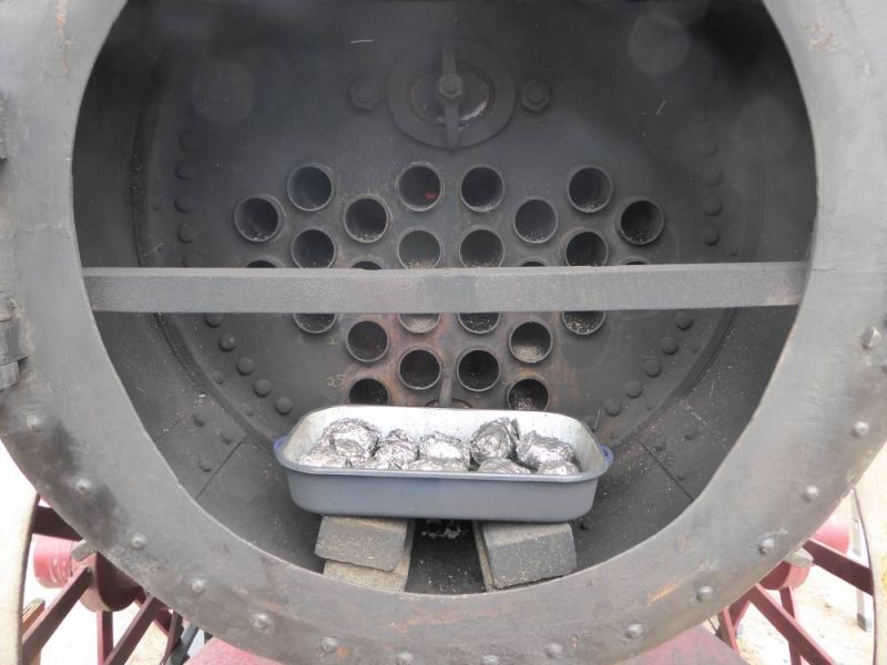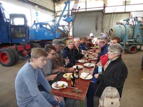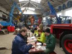 Bereits am frühen Morgen wurde auch unser Schlachtkessel angeheizt. Wer viel arbeitet soll auch gut essen. So wurde unser schon traditionelles Kesselfleischessen mit dem Arbeitseinsatz verbunden. In der großen Halle wurde aufgetischt. Die Maschinen gaben eine gute Kulisse und der Tieflader wurde als Buffet-Tafel zweckentfremdet. Dazu wurde eine Delegation des Heimatvereins geladen, wurde doch am vergangenen Samstag eine besondere Maschine übergeben.