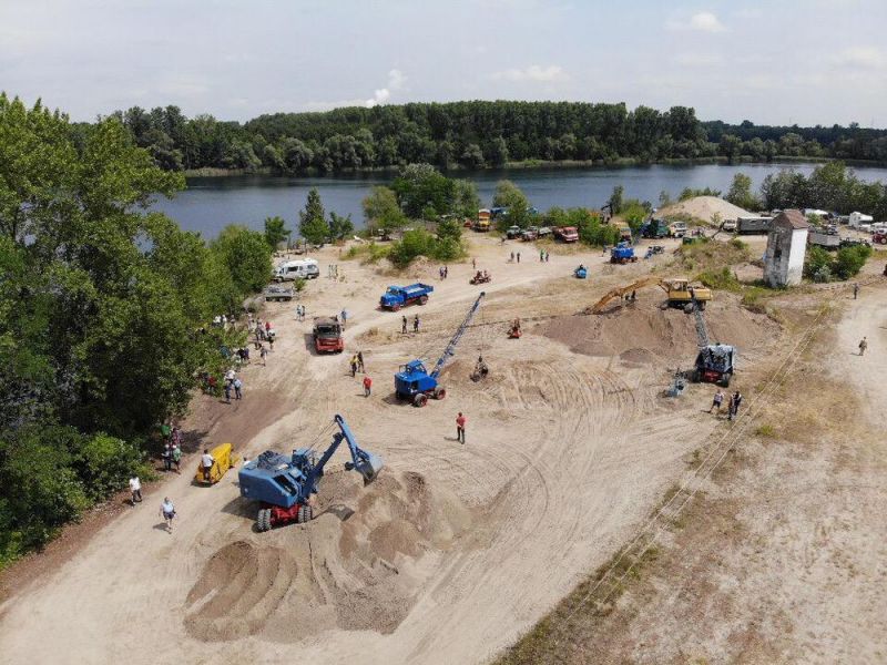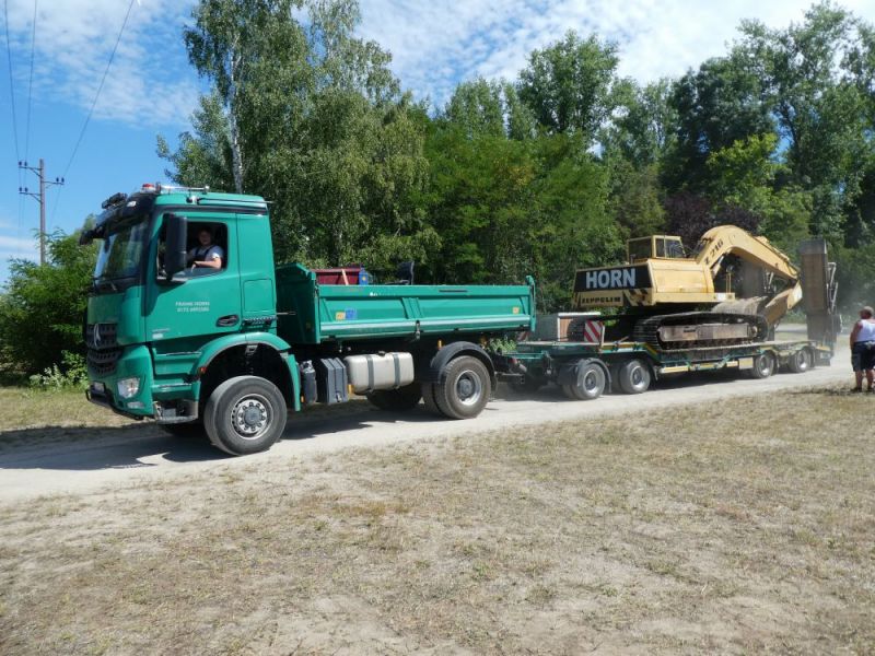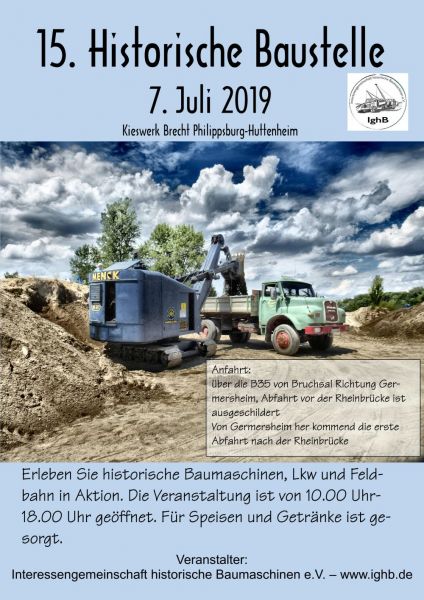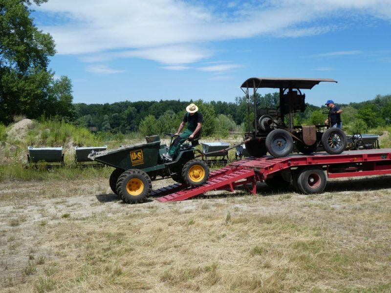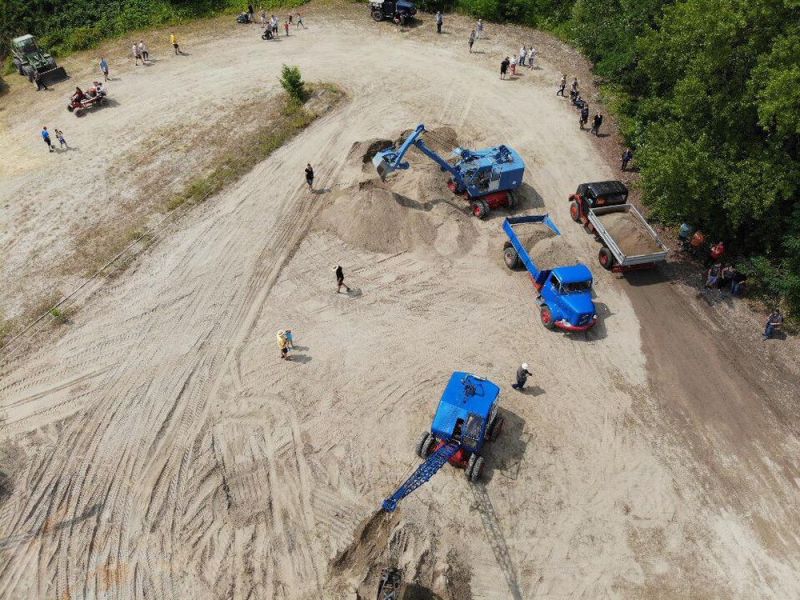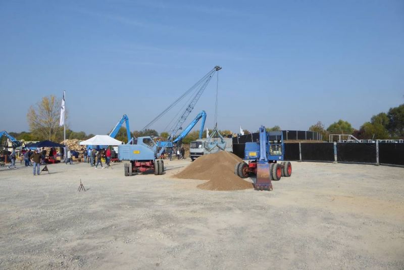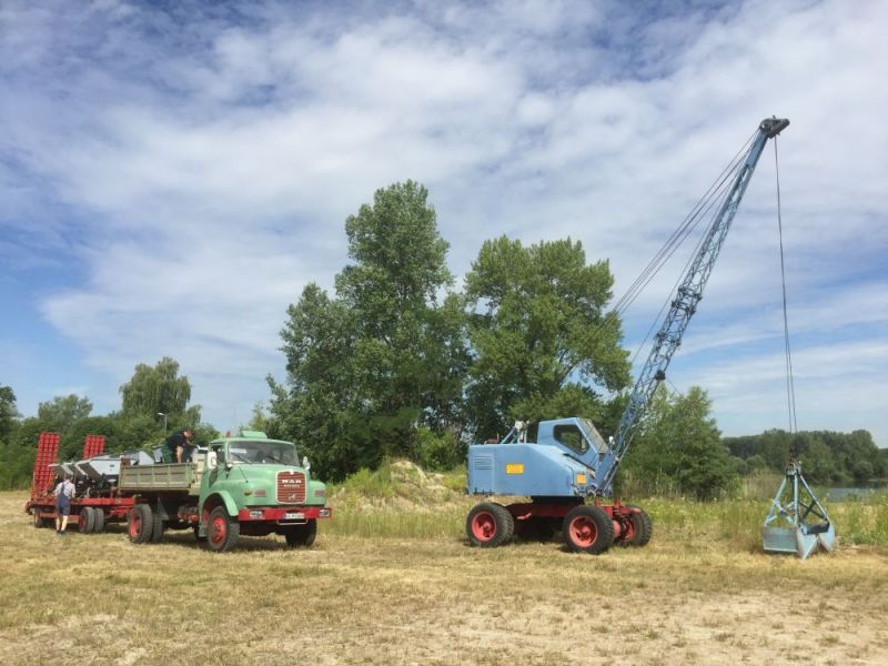 In diesem Jahr konnten wir noch einmal das stillgelegte Kieswerk Brecht in Huttenheim für unsere historische Baustelle nutzen. Abweichend vom bisherigen Konzept war die Veranstaltung nur am Sonntag für Besucher geöffnet. Das Konzept ging auf, wir konnten für Sonntags ausreichend Personal stellen und Samstag kamen auch unsere Mitglieder auf ihre Kosten. Am Freitag ging es dann recht früh los mit den Transporten und dem Aufbau. Da waren bereits die ersten weitgereisten Mitglieder zur Unterstützung vor Ort. Die Transportmannschaft schaffte fünf Transporte am Freitag, so daß die Baustelle mit ausreichend eigenen Maschinen bestückt war. Am aufwändigsten war der Feldbahnzug zu transportieren, da jede Lore separat auf dem Tieflader gesichert werden musste. Am Samstag fand dann der erste, nichtoffizielle Teil der Veranstaltung statt. Da konnten alle Maschinisten ihre Maschinen fahren, testen und eventuelle Mängel abstellen. Der restliche Aufbau fand ohne Stress statt. Und abends traf man sich am See zum Feierabendbier.