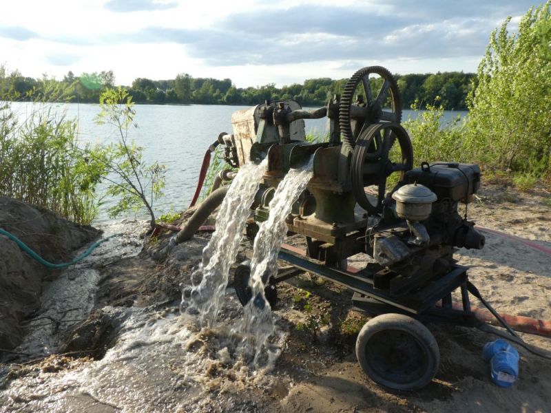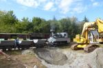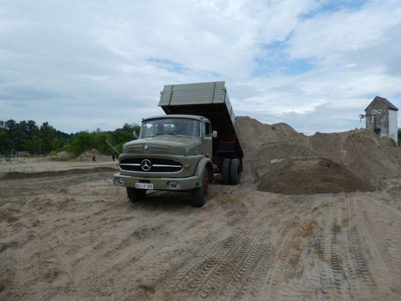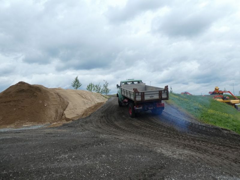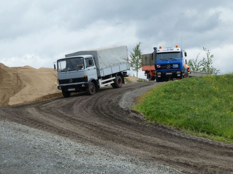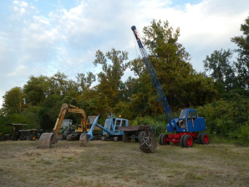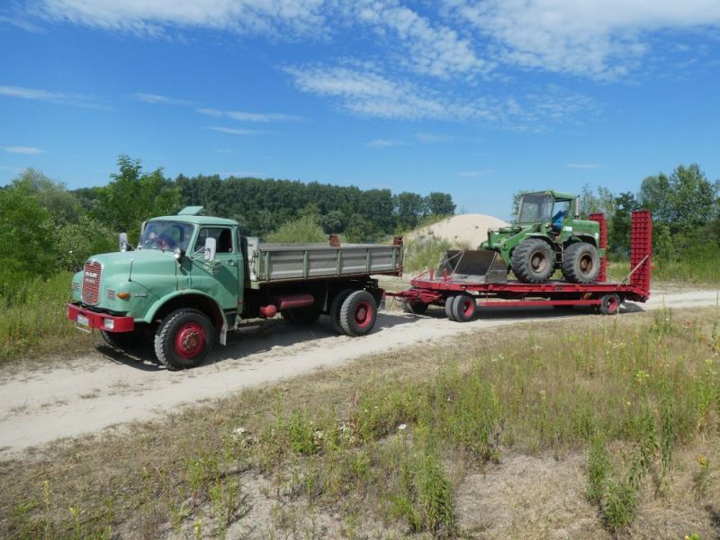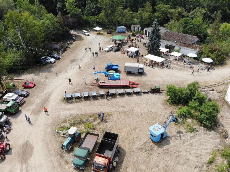 In diesem Jahr konnten wir noch einmal das stillgelegte Kieswerk Brecht in Huttenheim für unsere historische Baustelle nutzen. Abweichend vom bisherigen Konzept war die Veranstaltung nur am Sonntag für Besucher geöffnet. Das Konzept ging auf, wir konnten für Sonntags ausreichend Personal stellen und Samstag kamen auch unsere Mitglieder auf ihre Kosten. Am Freitag ging es dann recht früh los mit den Transporten und dem Aufbau. Da waren bereits die ersten weitgereisten Mitglieder zur Unterstützung vor Ort. Die Transportmannschaft schaffte fünf Transporte am Freitag, so daß die Baustelle mit ausreichend eigenen Maschinen bestückt war. Am aufwändigsten war der Feldbahnzug zu transportieren, da jede Lore separat auf dem Tieflader gesichert werden musste. Am Samstag fand dann der erste, nichtoffizielle Teil der Veranstaltung statt. Da konnten alle Maschinisten ihre Maschinen fahren, testen und eventuelle Mängel abstellen. Der restliche Aufbau fand ohne Stress statt. Und abends traf man sich am See zum Feierabendbier.