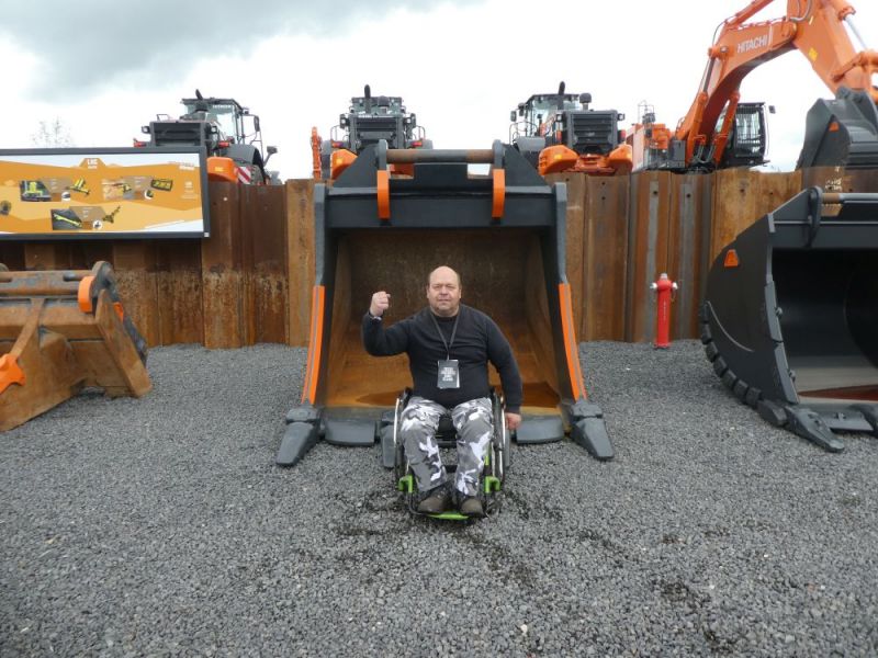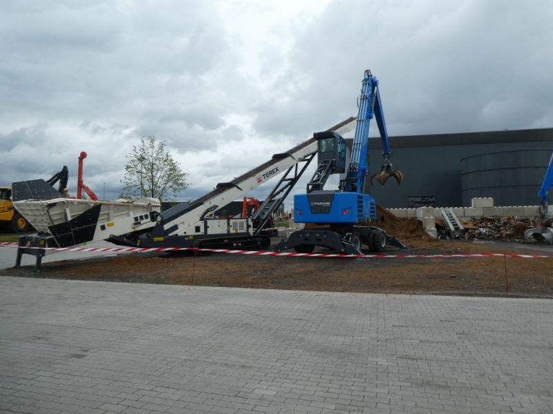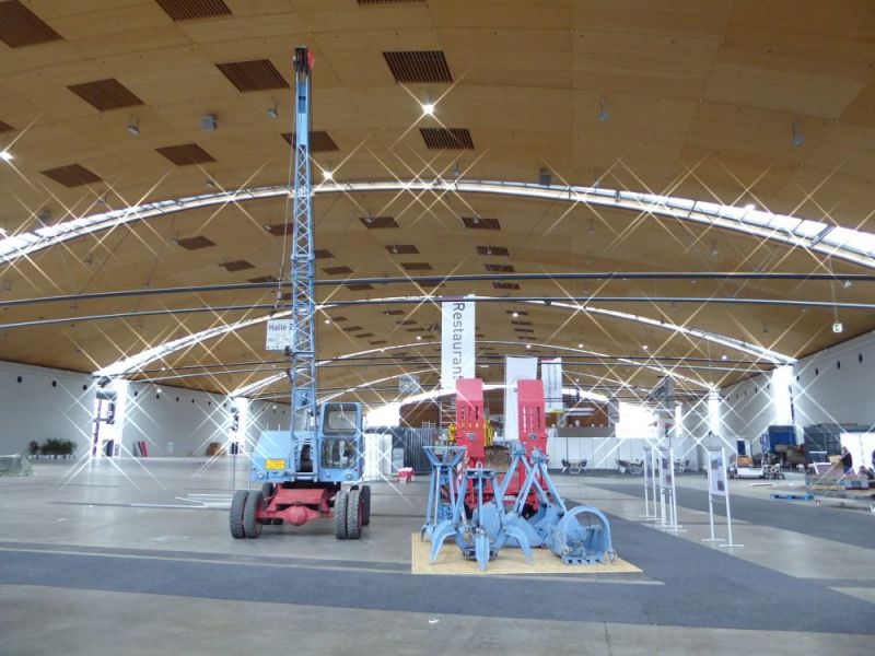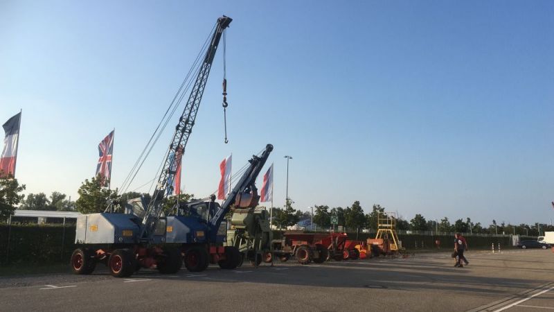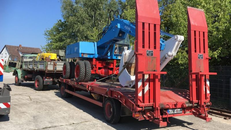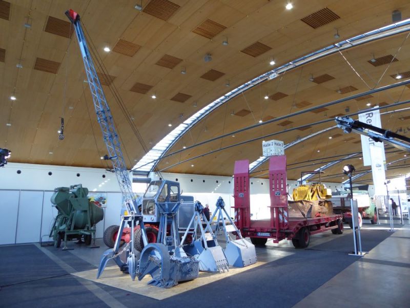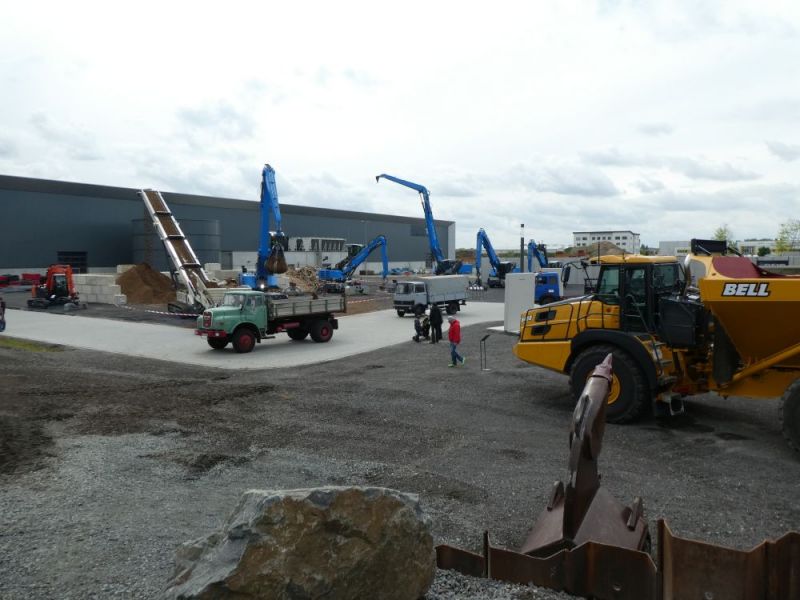 Am darauffolgenden Samstag wurde eine vierte Tour gefahren. Der Fuchs 702 macht sich gut auf dem Tieflader. Dann wurden die Maschinen auf dem Messegelände verteilt. Dabei durfte der Fuchs 301 mit Tieflöffel auch als Kran arbeiten.