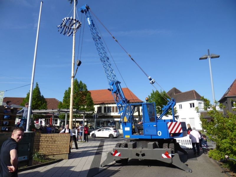 So lange in Wiesental die Tradition des Maibaumstellens wieder aufgenommen wurde, so lange beteiligen wir uns mit einem historischen Kran daran. Bisher war immer unser Fuchs 301 Baujahr 1968 das Arbeitstier der Veranstaltung. Dieser stand jedoch noch auf dem Tieflader; hatten wir doch am Abend vorher noch unseren Messestand in Karlsruhe abgebaut. Und so kam zum ersten mal unser Fuchs 110 in Einsatz. Angesichts der Größe des Maibaums und den Windverhältnissen wohl auch die bessere Lösung. Die Maschine Baujahr 1982 hat auch schon 35 Jahre auf dem Buckel und kann damit die Nachfolge des 301 als Oldtimer würdig antreten. Immerhin hat der 110er das gleiche Alter wie der 301er als der erste Maibau wieder gestellt wurde.
