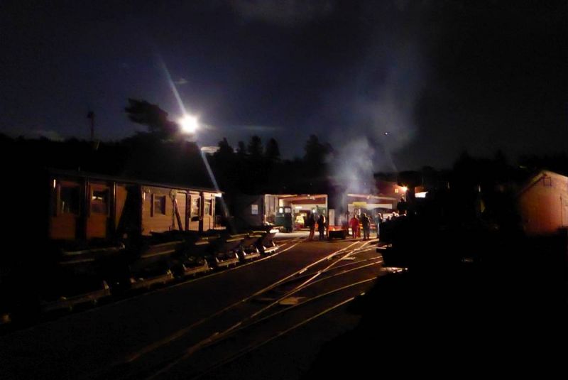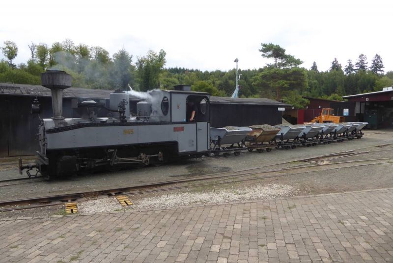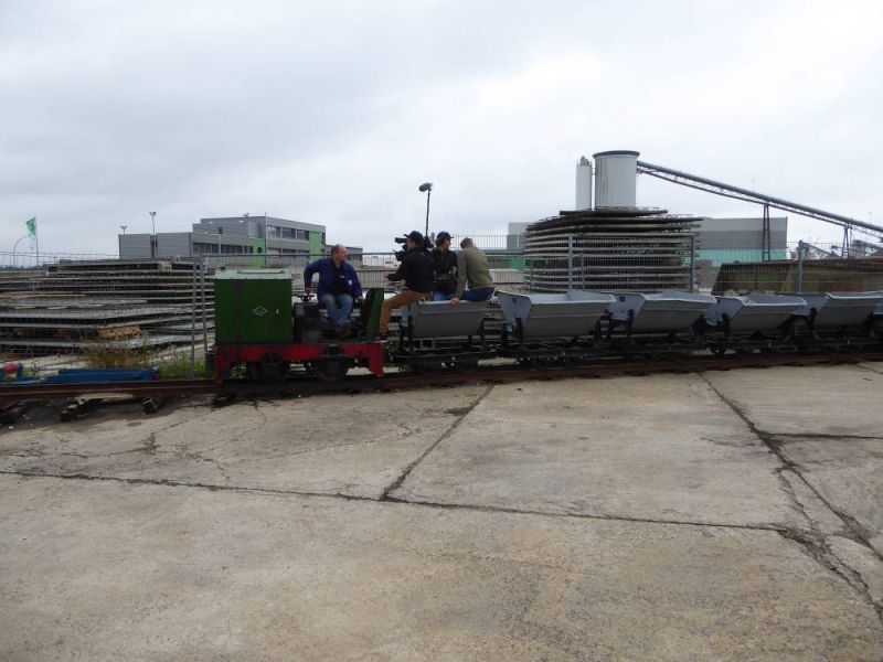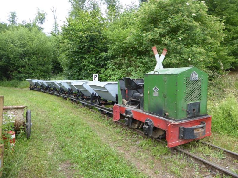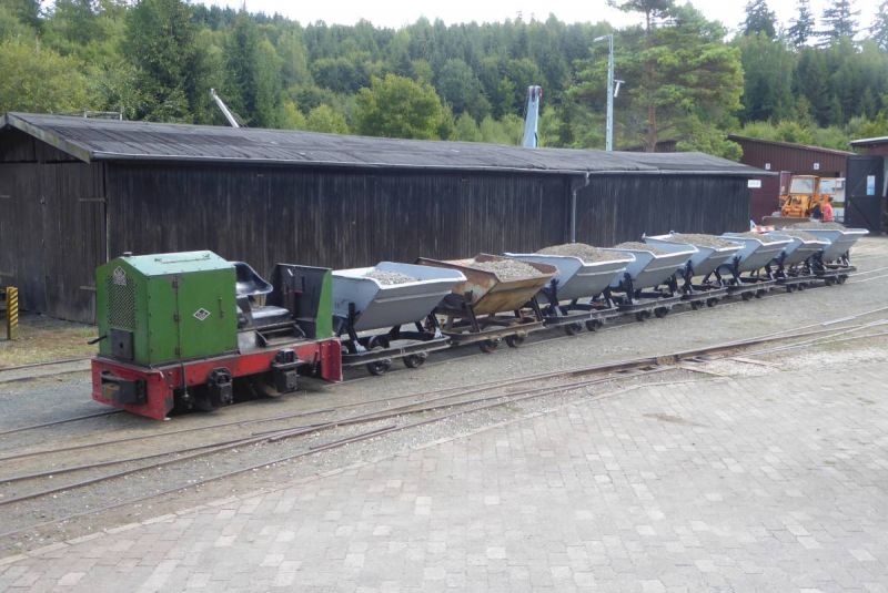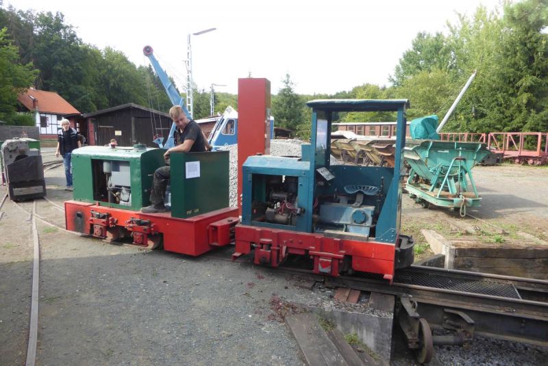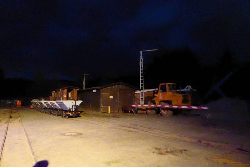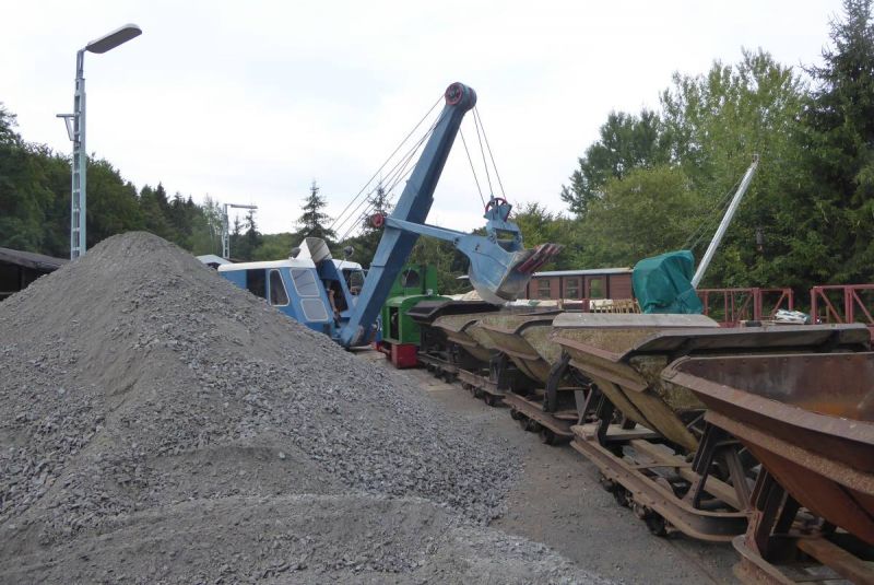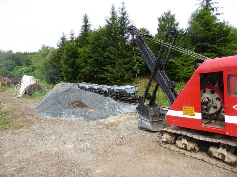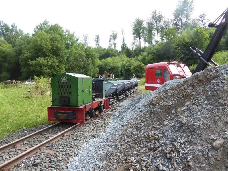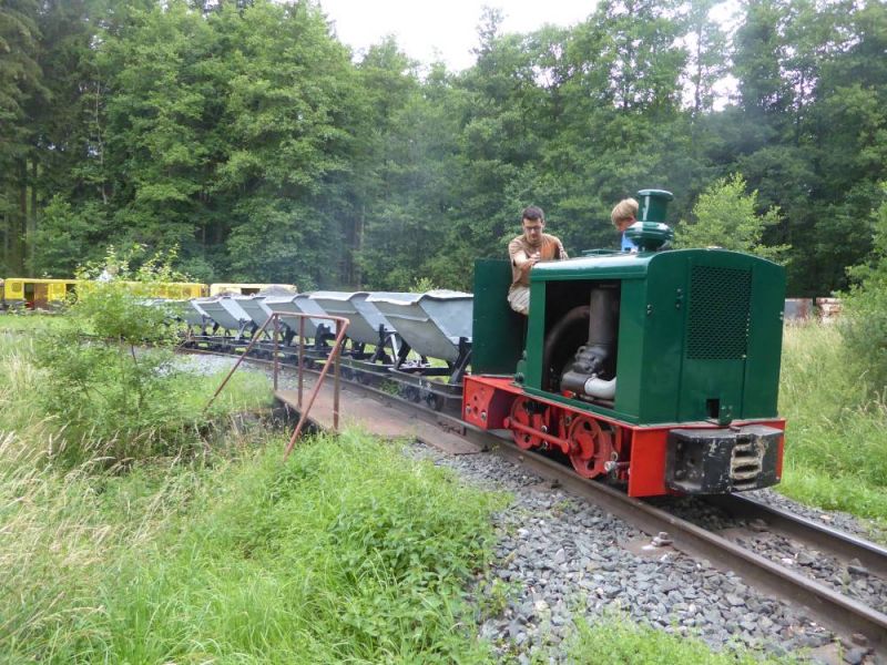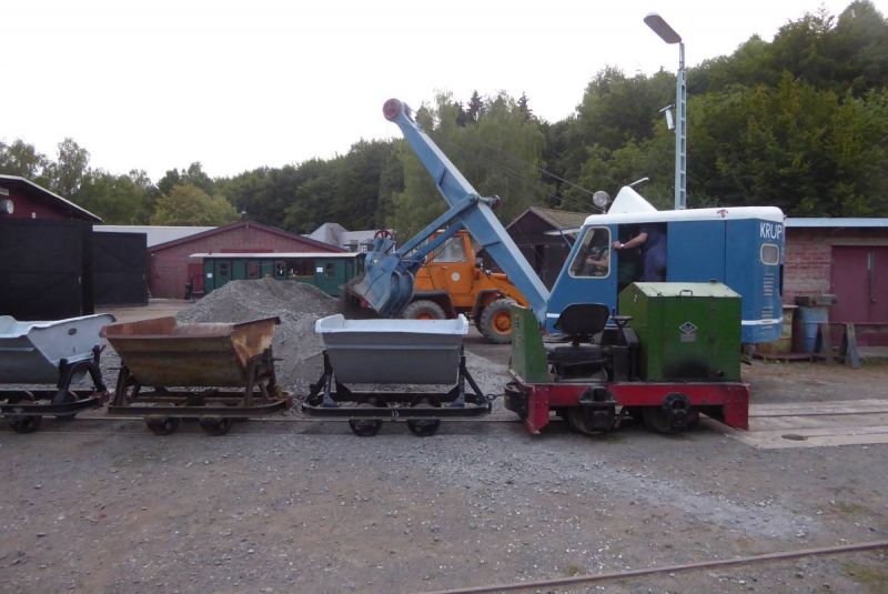 Nach dem Abladen wurde zunächst der ganze Zug leer auf die Strecke geschickt. Immerhin ist diese ca. 2,5km lang und mit Steigungen und Gefälle versehen. Da musste ein Probelauf durchgeführt werden. Danach wurde der Zug voll beladen und mit Abstand fuhren zwei schwere Grubenloks als Notbremsloks voraus um auch die Bremswirkung bei vollem Zug zu testen. Alles verlief reibungslos. Dann konnten die Verladespiele losgehen. Mit wechselnden Loks wurde der Zug immer wieder auf die Strecke geschickt, abgekippt, neu beladen und das Ganze von vorne. Imposant war auch der O&K Hochlöffel-Bagger, welcher die Loren professionel belud. Am Abend gab es dann natürlich die an solchen Treffen üblichen Dieselgespräche. Dabei lernten sich viele Leute kennen, welche bis dahin eigentlich nur über das Kipploreforum Kontakt hatten. Und sehr interessant war dann auch die Führung unter Tage am Sonntag. Für uns war das Treffen auch ein gelungener Probelauf für unsere historische Baustelle im August.