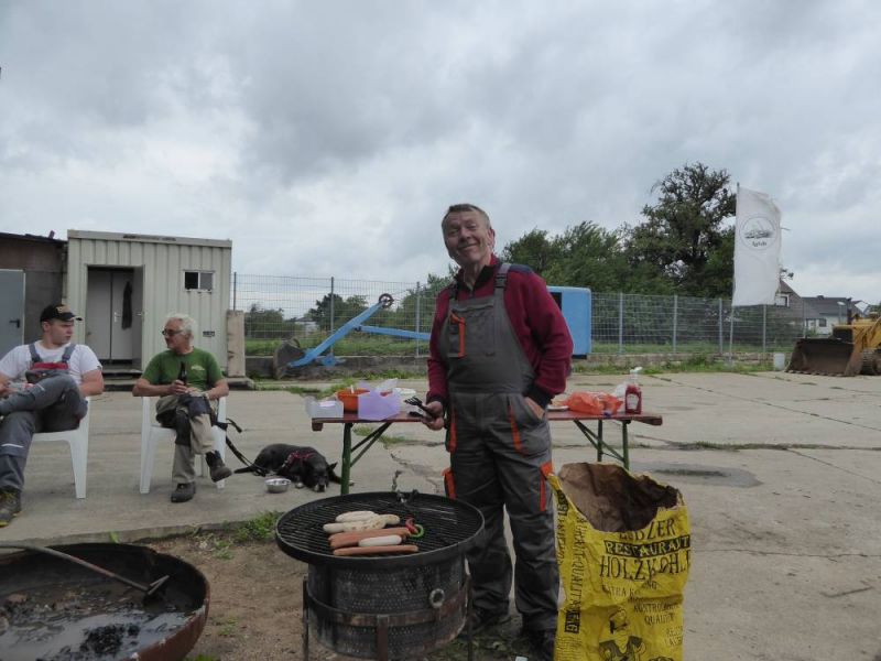 Nachdem wir uns vor einigen Jahren einen brauchbaren Wurstkessel zugelegt hatten gibt es nun jährlich einmal ein Kesselfleischessen in unserer Halle. Letzten Samstag war es wieder soweit. Bereits am frühen morgen wurde der Kessel eingeheizt. Das schöne Frühlingswetter lockte dann auch viele Mitglieder auf unser Gelände und so wurden Maschinen für die nächste Saison vorbereitet. In der ersten Aprilwoche kommen einige Maschinen nach Berlin zu Filmaufnahmen, diese mussten geputzt und technisch durchgesehen werden. Viel Arbeit an der frischen Luft macht hungrig, so machten sich unsere Aktiven um die Mittagszeit über das heiße Kesselfleisch her. Und während die meisten anschließend noch ihrer Arbeit nachgingen, verarbeitete unser Metzger-Team die Reste zu Schwartemagen. Den gibt's am nächsten Samstag. Harte Arbeit verlangt deftiges Essen.