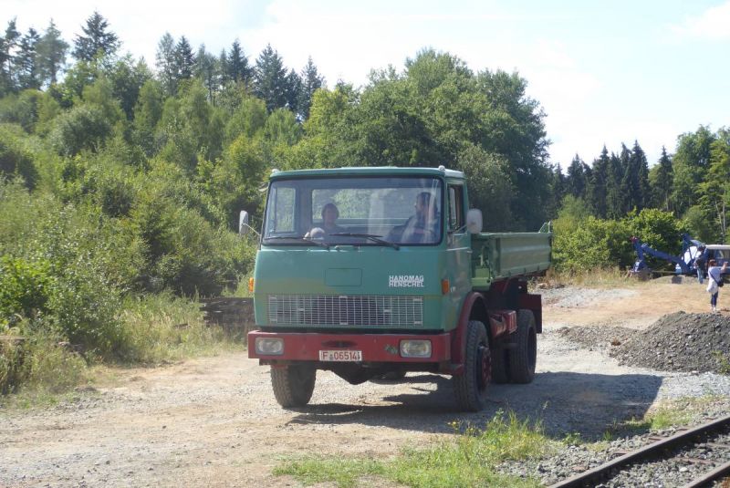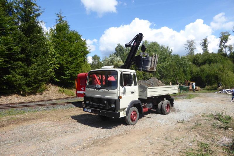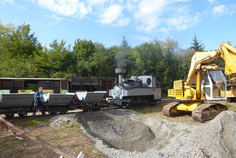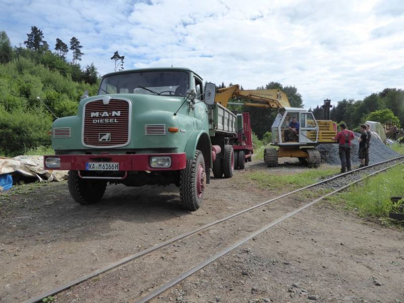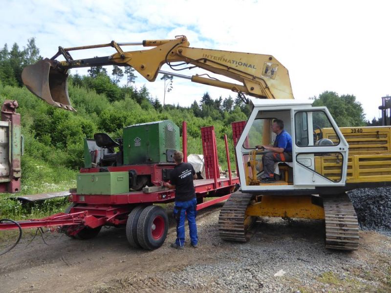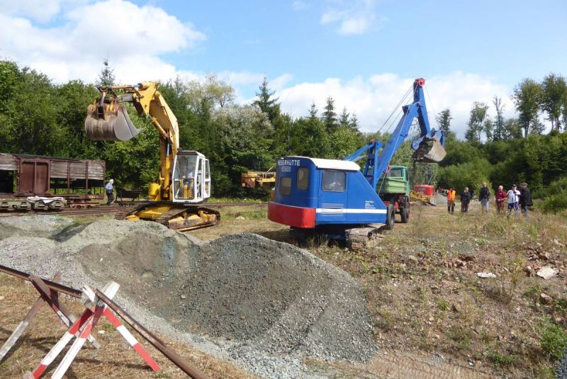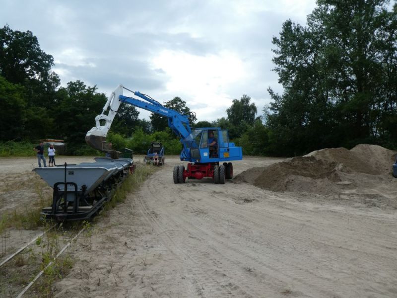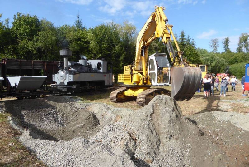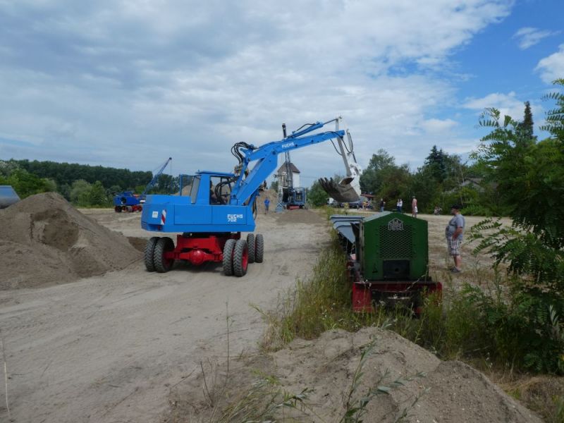 In diesem Jahr wagten wir mit unserer Historischen Baustelle den Sprung aus der Region. Gemeinsam mit dem Feld- und Grubenbahnmuseum Fortuna wurde die Veranstaltung auf deren Gelände durchgeführt. Bereits in den Wochen vorher wurden verschiedene Maschinen auf das Gelände gebracht. Ein Mitglied aus Giessen stellte einen Teil der Maschinen, da war die Anreise nicht so weit. Am Freitag, dem 24. 08. begab sich dann ein Konvoi unserer Lkw mit Tieflader auf die Reise Richtung Wetzlar. Dort angekommen konnten wir mit unseren Gerätschaften die Infrastruktur für die Veranstaltung ergänzen. Nach dem Aufbau wurde probegefahren. Im oberen Bahnhof auf dem Gelände lag ein großer Schotterhaufen, welcher mittels Bagger auf Loren verladen wurde und Richtung unteren Bahnhof befördert wurde. Nach 2,5km Fahrt mit der Feldbahn war dieser erreicht und der Zug wurde dort ausgekippt. An der Kippstelle übernahmen wieder Bagger den Schotter und verluden bereitgestellte Lkw, welche dann wieder nach oben fuhren. So wurde Materialumschlag von Lkw auf Felbahn und umgekehrt demonstriert. Zwei Schotterzüge fuhren abwechselnd, während einer auf der Strecke war wurde der andere Beladen. Dabei hatte ein Zug eine besondere Lok. Eine Dampflok aus dem ersten Weltkrieg zog die neun Wägelchen. Dawzischen verkehrte ein Personenzug, welcher Besucher in den unteren Bahnhof brachten. Insgesamt war das eine sehr interessante Veranstaltung, welche von vielen Gästen besucht wurde. Anhand der Kfz-Kennzeichen konnten wir Besucher bis aus Rastatt, Baden-Baden und Ludwigsburg ausmachen. Die Zusammenarbeit mit den Mitgliedern der Fortuna klappte hervorragend, letztendlich begegneten sich unsere Mitglieder als wäre es ein Verein. So wurde auch schon über eine Wiederholung der Veranstaltung diskutiert.