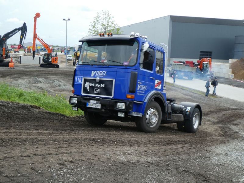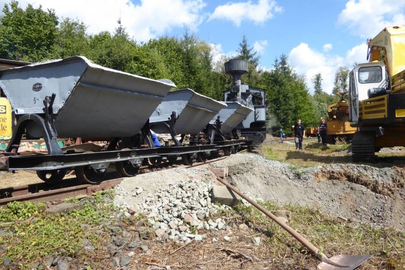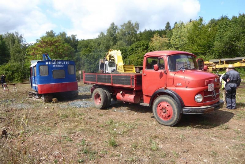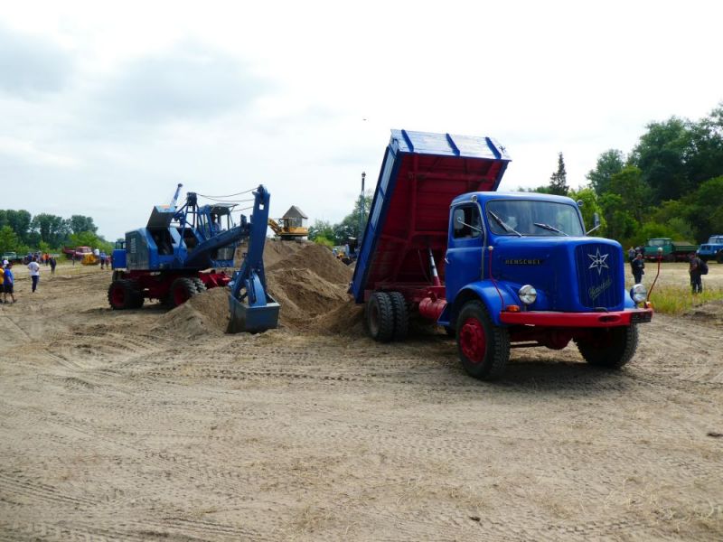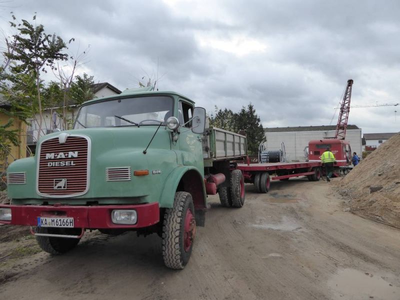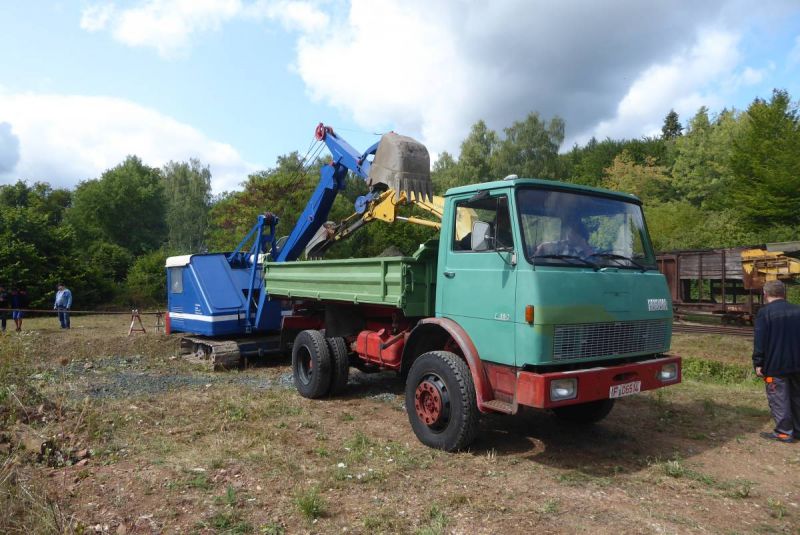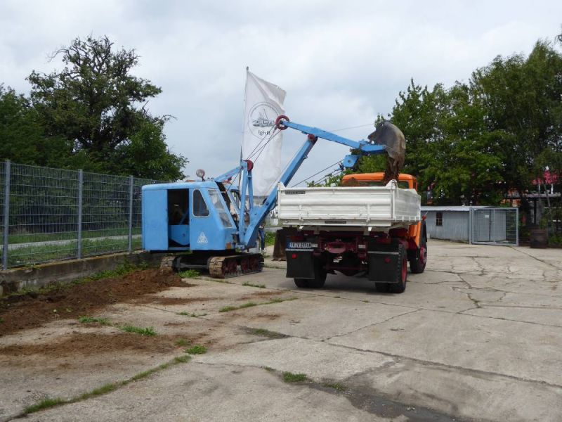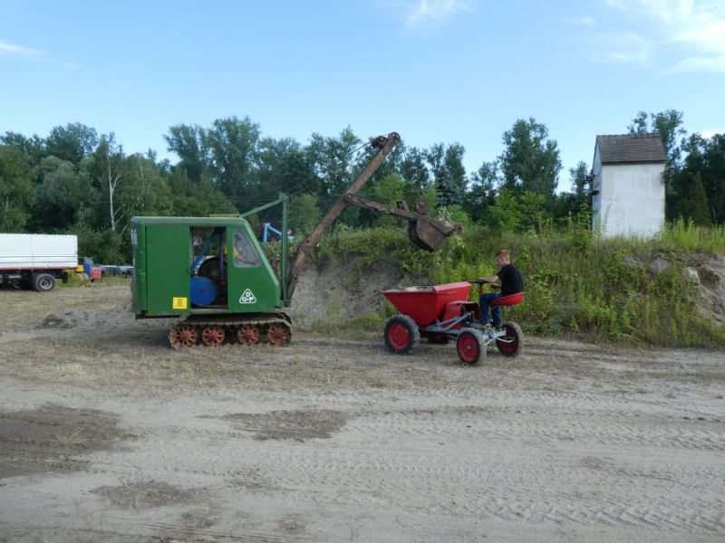 In diesem Jahr wagten wir mit unserer Historischen Baustelle den Sprung aus der Region. Gemeinsam mit dem Feld- und Grubenbahnmuseum Fortuna wurde die Veranstaltung auf deren Gelände durchgeführt. Bereits in den Wochen vorher wurden verschiedene Maschinen auf das Gelände gebracht. Ein Mitglied aus Giessen stellte einen Teil der Maschinen, da war die Anreise nicht so weit. Am Freitag, dem 24. 08. begab sich dann ein Konvoi unserer Lkw mit Tieflader auf die Reise Richtung Wetzlar. Dort angekommen konnten wir mit unseren Gerätschaften die Infrastruktur für die Veranstaltung ergänzen. Nach dem Aufbau wurde probegefahren. Im oberen Bahnhof auf dem Gelände lag ein großer Schotterhaufen, welcher mittels Bagger auf Loren verladen wurde und Richtung unteren Bahnhof befördert wurde. Nach 2,5km Fahrt mit der Feldbahn war dieser erreicht und der Zug wurde dort ausgekippt. An der Kippstelle übernahmen wieder Bagger den Schotter und verluden bereitgestellte Lkw, welche dann wieder nach oben fuhren. So wurde Materialumschlag von Lkw auf Felbahn und umgekehrt demonstriert. Zwei Schotterzüge fuhren abwechselnd, während einer auf der Strecke war wurde der andere Beladen. Dabei hatte ein Zug eine besondere Lok. Eine Dampflok aus dem ersten Weltkrieg zog die neun Wägelchen. Dawzischen verkehrte ein Personenzug, welcher Besucher in den unteren Bahnhof brachten. Insgesamt war das eine sehr interessante Veranstaltung, welche von vielen Gästen besucht wurde. Anhand der Kfz-Kennzeichen konnten wir Besucher bis aus Rastatt, Baden-Baden und Ludwigsburg ausmachen. Die Zusammenarbeit mit den Mitgliedern der Fortuna klappte hervorragend, letztendlich begegneten sich unsere Mitglieder als wäre es ein Verein. So wurde auch schon über eine Wiederholung der Veranstaltung diskutiert.