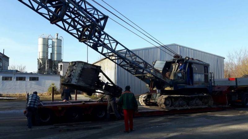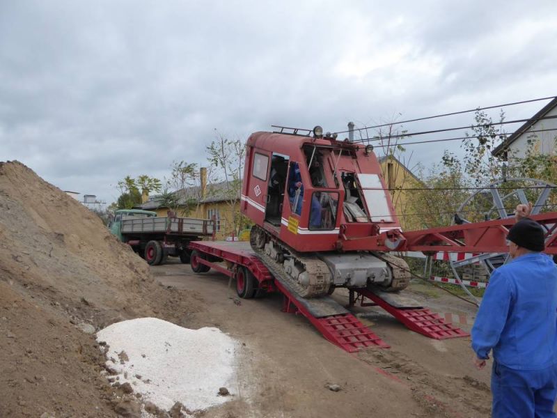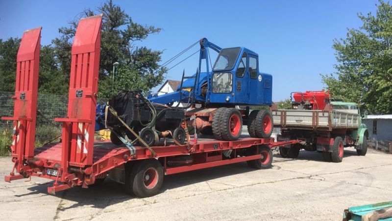 den Ausleger abbauen, den Greifer ausscheren und die umlaufende Gangway demontieren. Der Transport bedingte dann aber ein Spezialfahrzeug und eine Transportgenehmigung. Durch Bayern verlief der Transport dann mit Polizeibegleitung, ab der Landesgrenze war dann nur noch ein Begleitfahrzeug notwendig. Und der Transport durfte nur nachts fahren. So startete dieser am vergangenen Mittwoch abend und kam am frühen Donnerstag morgen in Waghäusel an. Dort wurde dann auch gleich abgeladen, der Lkw musste weiter. So wurde die Maschine erst einmal mit demontierten Ausleger abgestellt.