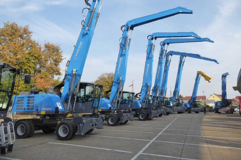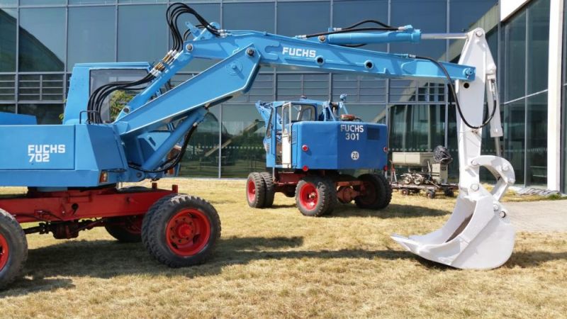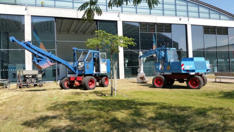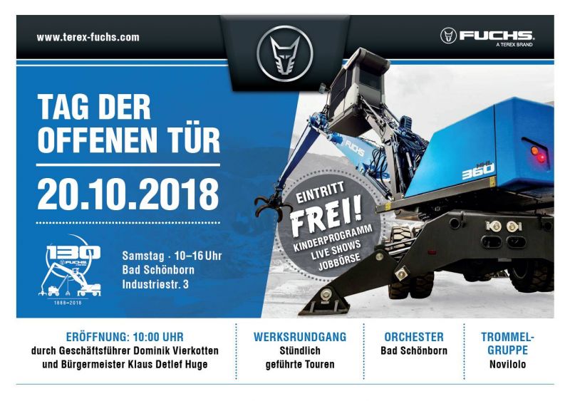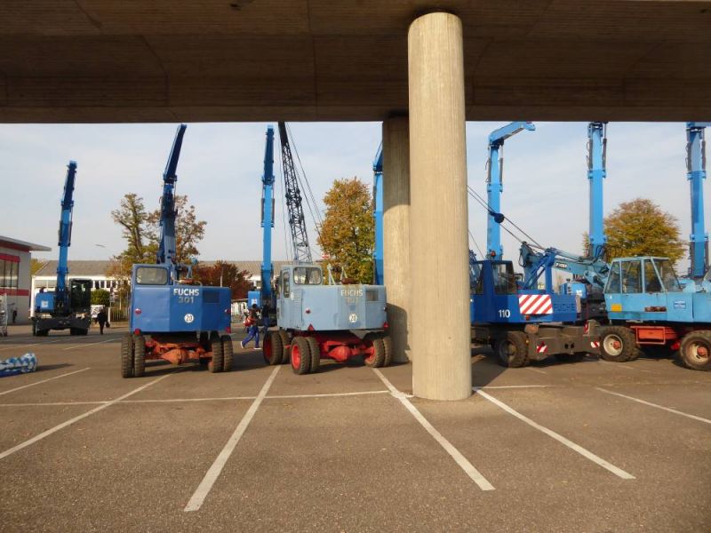 In der Zeit vom 18. bis 20. Oktober 2018 feierte die Firma Fuchs ihr 130jähriges Jubiläum. In dieser Zeit hat die Firma sich von einer kleinen Dorfschmiede zum Global-Player entwickelt. Die Unternehmensgeschichte begann in einer kleinen Dorfschmiede in Ditzingen, wo Pferde und Ochsen beschlagen wurden und landwirtschaftliche Geräte instandgesetzt wurden. Daraus wurde zunächst ein Stalleinrichtungsbauer. Nach dem zweiten Weltkrieg wurden die in Ditzingen gebauten Dunglader D1, D2 und D3 zurm Wiederaufbau in Deutschland verwendet und zu richtigen Seilbaggern entwickelt. Mit dem Fuchs 301 begann der Siegeszug der Firma. In den 1980er Jahren wurde dann die Entwicklung von Umschlagmaschinen vertieft. 1985 ging das Familienunternehmen in Konkurs und wurde von der Firma Schaeff übernommen. 2005 wiederum wurde Schaeff gemeinsam mit Fuchs von Terex übernommen. Der Name Fuchs wurde niemals gelöscht, vielmehr ist er so gut eingeführt, daß das Werk nacheinander unter Terex-Fuchs, Fuchs-Terex und heute Fuchs, a Terex-Brand firmiert. Damit ist auch das alte Firmenlogo, ein stilisierter Fuchs-Kopf wieder auf den Maschinen zu finden.