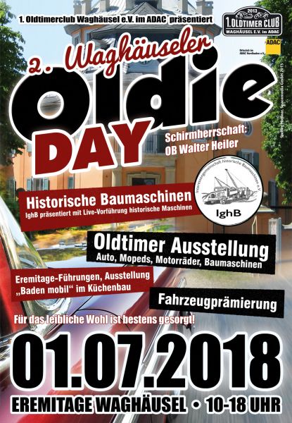 In diesem Jahr veranstaltete der 1. Oldtimerclub Waghäusel seinen 2. Waghäusler Oldie-Day. Über 500 Oldtimer trafen sich auf dem städtischen Gelände der Eremitage in Waghäusel. An diese gut organisierten Veranstaltung war die IghB mit einem eigenen Bereich beteiligt. Neben der Lkw-Ausstellung waren ferngesteuerte Baumaschinen und Lkw in Betrieb zu sehen. Da traditionell an diesem Wochenende historische Baustelle gewesen wäre, wurden für unsere treuen Besucher einige Maschinen im Betrieb vorgeführt.