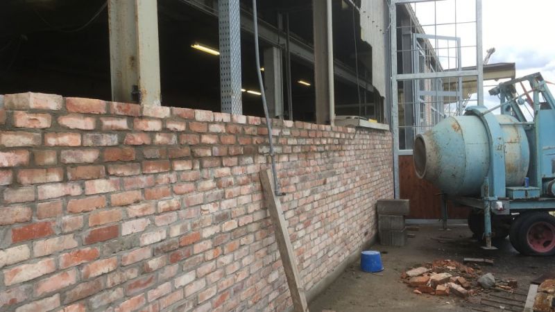 Nachdem bereits 2017 die neuen Tore gesetzt wurden, konnten in diesem Jahr wesentliche Fortschritte an der Ostfassade erzielt werden. Nachdem die unteren Torfüllungen eingebaut und die erste Reihe Scheiben eingesetzt wurden, konnte das erste Rolltor ausgebaut werden. Gleichzeitig wurde ein Freiraum mit Hohlblocksteinen ausgemauert und mit Ziegeln vorgemauert werden. Dabei entsteht ein einfacher Läuferverband und kein Kreuzverband, wie er bei reinen Ziegelmauerwerken zu sehen wäre. Das interessiert vielleicht nur den Fachmann. Für den Laien ist die Ziegeloptik entscheidend.