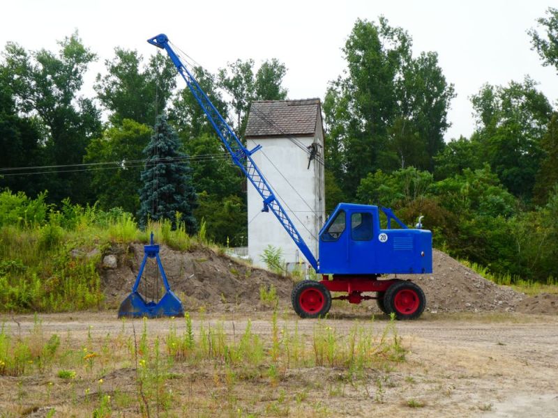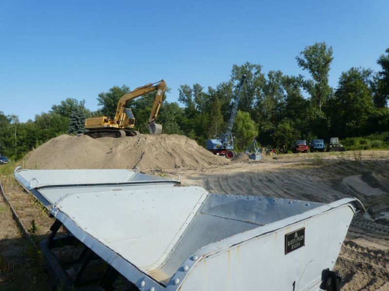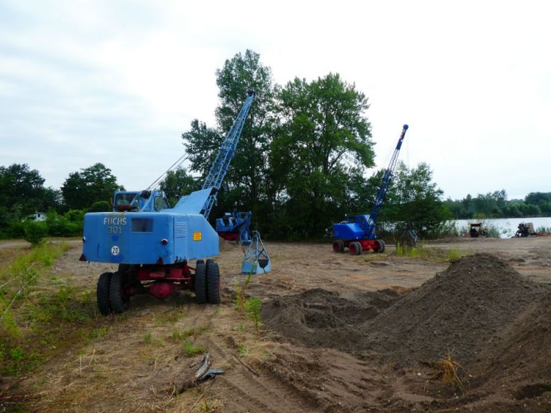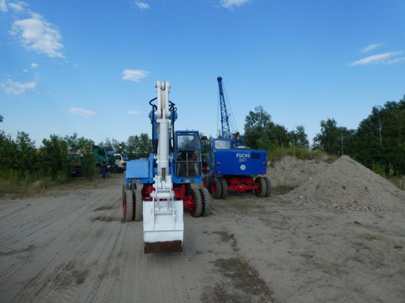 Am Sonntag wurde dann für die Besucher geöffnet. Und die kamen zahlreich. Da wir mittlerweile interessante Stücke in unsere Sammlung aufnehmen konnten, war eine abwechslungsreiche Palette vor Ort. Neben Seilbaggern, Ladern und Lkw wurden auch verschiedene Kleingeräte präsentiert. Zum ersten mal konnte auch die historische Fahrsäge im Einsatz präsentiert werden, welche erst vor einiger Zeit vom Heimatverein übernommen wurde. Ein weiteres, auch persönliches Highlight war der Erste Einsatz des Fuchs 702, den unserer Rollifahrer in zahlreichen Stunden selbst restauriert hat. Den Hydraulikbagger kann der Besitzer auch trotz seiner Behinderung bedienen, da er durch entsprechenden Umbau auf seine Füße verzichten kann. Dank zahlreicher Hände lief dann auch der Abbau am Sonntag und Montag reibungslos. Im Laufe dieser Woche werden noch die restlichen Maschinen abgeholt, danach kehrt wieder Ruhe ein auf dem alten Kieswerkgelände.